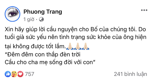 Tối ngày 28/8, trên Facebook cá nhân, em gái đang sinh sống tại Mỹ của NS Hoài Linh viết: "Xin hãy giúp lời cầu nguyện cho bố của chúng tôi. Do tuổi già sức yếu nên tình trạng sức khoẻ của ông hiện tại không được tốt lắm. Đêm đêm con thắp đèn trời, cầu cho cha mẹ sống đời với con". Theo lời Phương Trang, bố ruột của cô và NS Hoài Linh đang gặp vấn đề về sức khoẻ do tuổi già sức yếu, nhưng cầu mong mọi người hãy cầu nguyện để ông tai qua nạn khỏi.