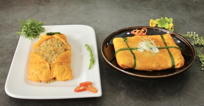 Món cơm chiên bọc trong túi trứng chiên vàng óng, thơm nức, cùng nhân cơm lạ miệng ăn kèm dưa cải chua giòn, sần sật của trứng cá chuồn.