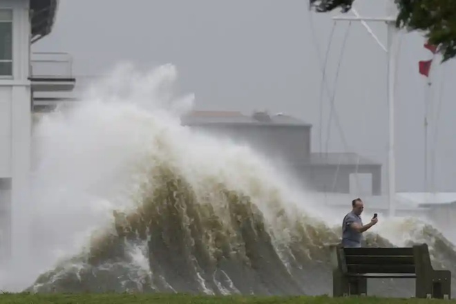 Một người chụp ảnh sóng lên cao dọc bờ hồ Pontchartrain tại New Orleans. Ảnh: AP.