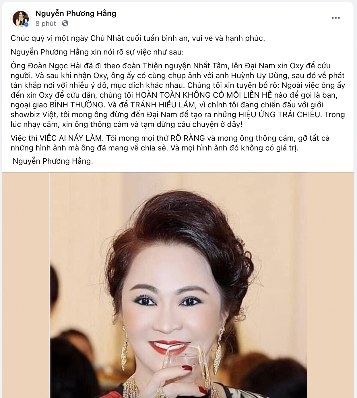 Tuy nhiên trong động thái mới nhất, bà Phương Hằng lại không đồng ý khi những hình ảnh này được chia sẻ rầm rộ trên MXH. Trên Facebook, nữ CEO đã gửi đến thông điệp rằng vợ chồng bà và ông Hải hoàn toàn không có mối quan hệ gì.