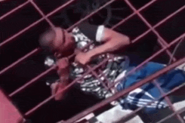 Theo camera an ninh gia đình ghi lại, tên trộm đang cố loay hoay tìm cách thoát thân nhưng đầu và 1 tay bị kẹt bên trên hàng rào, còn phần thân ở phía dưới.