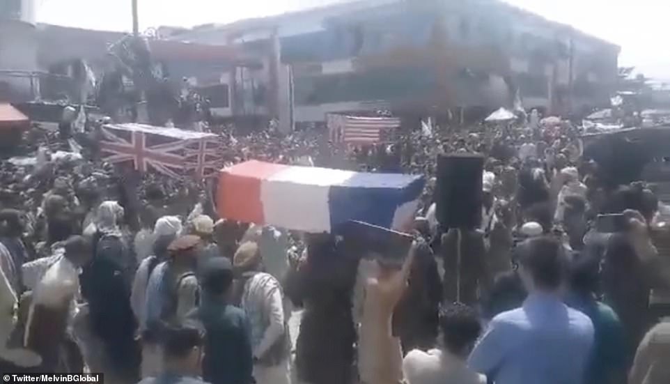 Các quan tài phủ quốc kỳ Mỹ, Anh, Pháp cũng như gắn phù hiệu NATO, được đám đông trung thành với Taliban diễu hành trên các con phố ở thành phố Khost. Chỉ mới 2 tuần trước, làn sóng biểu tình chống Taliban vẫn còn diễn ra ở chính thành phố này, theo Daily Mail.