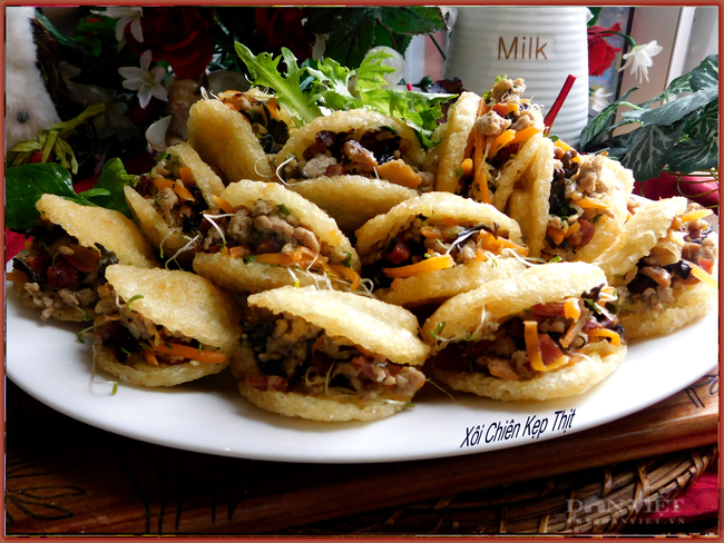 Trình bày món xôi chiên kẹp thịt
