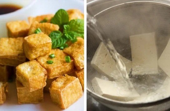 Việc này giúp hơi nước bên trong đậu phụ sẽ được đẩy ra ngoài. Nhờ vậy mà miếng đậu phụ giữ được hình dáng đẹp và chắc chắn hơn. Bạn cũng có thể thêm một chút muối vào nồi nước sôi sẽ giúp hiệu quả cao hơn.
