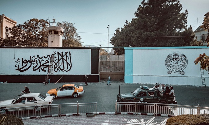 Taliban sơn lá cờ màu trắng cùng biểu tượng của lực lượng này lên tường đại sứ quán cũ của Mỹ ở Kabul, hành động bị cho là khiêu khích.