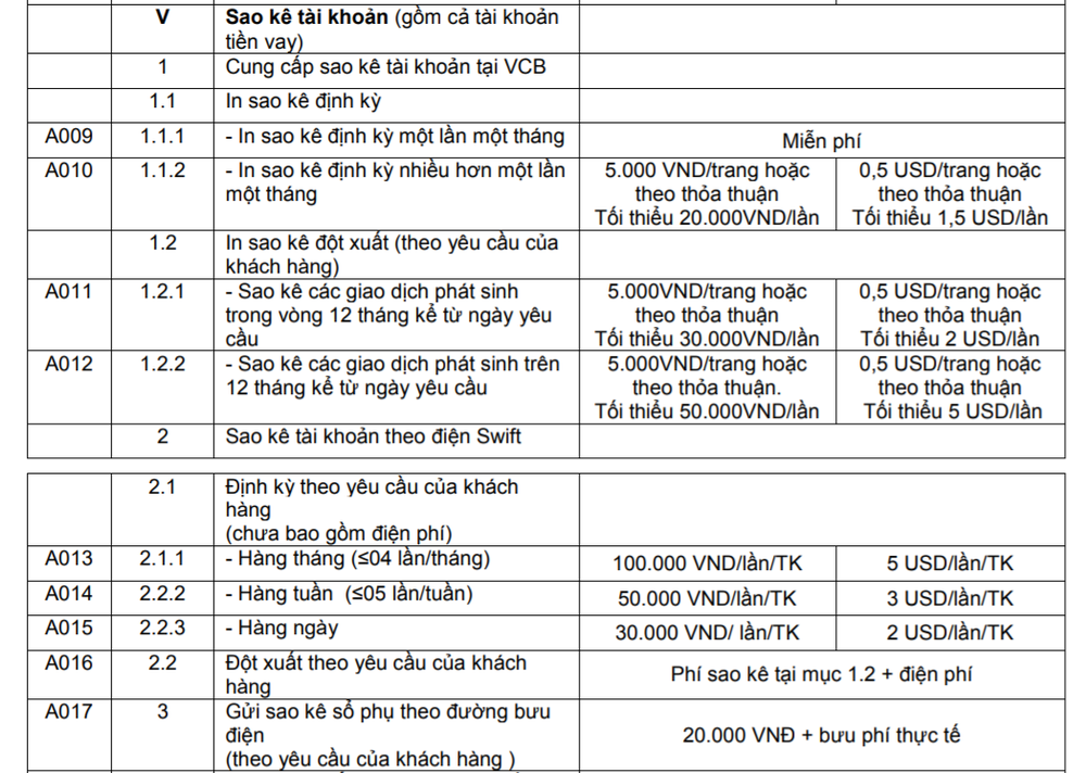 Đối với yêu cầu sao kê đột xuất của khách hàng, chi phí sao kê các giao dịch phát sinh trên 12 tháng, phí tối thiểu 5.000 đồng/trang hoặc theo thỏa thuận, tối thiểu 50.000 đồng.