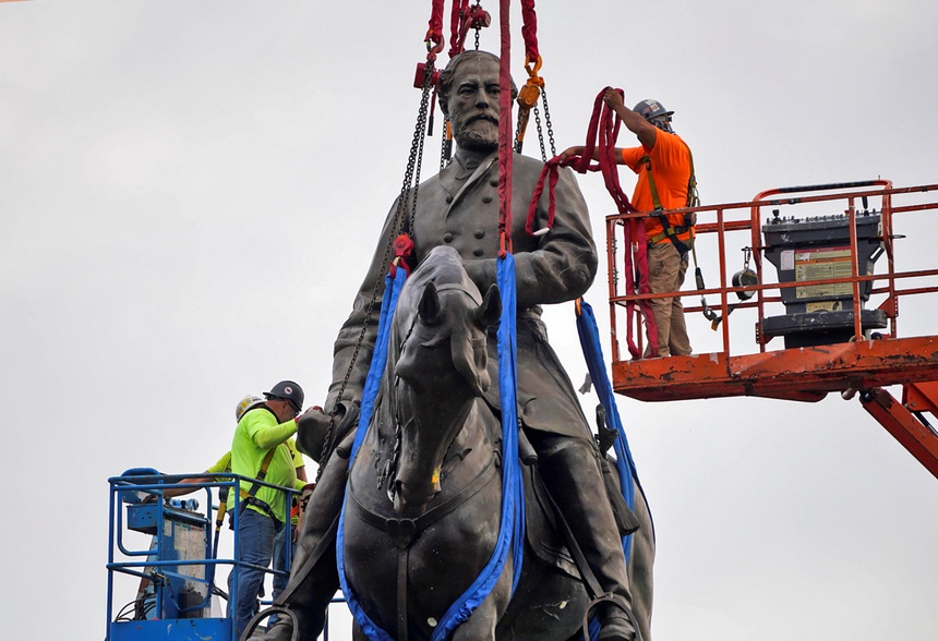 Một đội ngũ đã sử dụng cần cẩu và các thiết bị khác để nâng bức tượng của tướng Robert E.Lee, Tư lệnh Liên minh miền Nam trong cuộc Nội chiến Mỹ ở thế kỷ 19, khỏi bục đỡ. Bức tượng này đã đứng sừng sững tại một khu vực nổi bật của Virginia trong hơn nửa thế kỷ.
