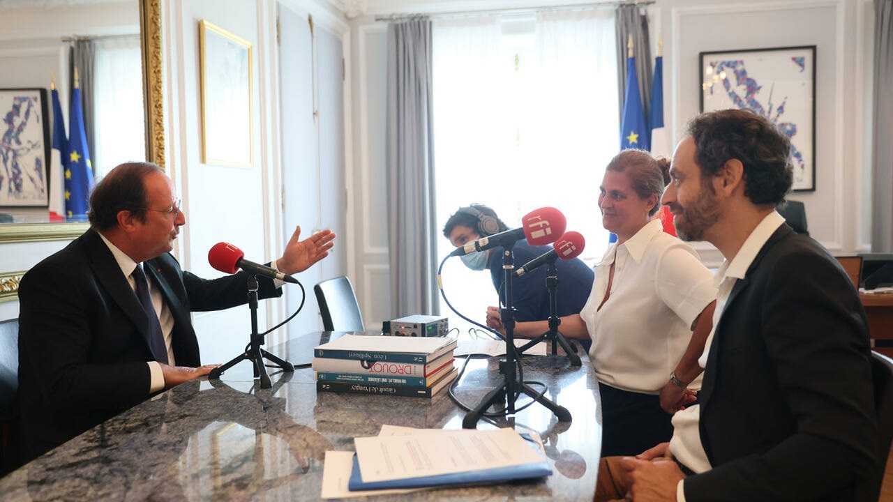Cựu tổng thống Pháp François Hollande (T) trả lời phỏng vấn của RFI (Valérie Gas và Romain Auzouy) vào mùa hè năm 2021. Pierre RENE-WORMS / FMM - PIERRE RENE-WORMS