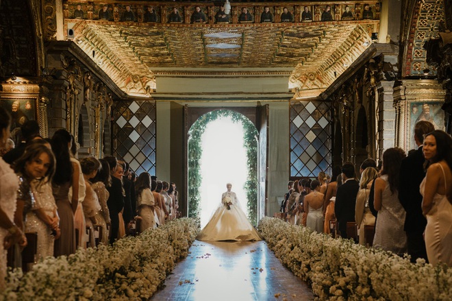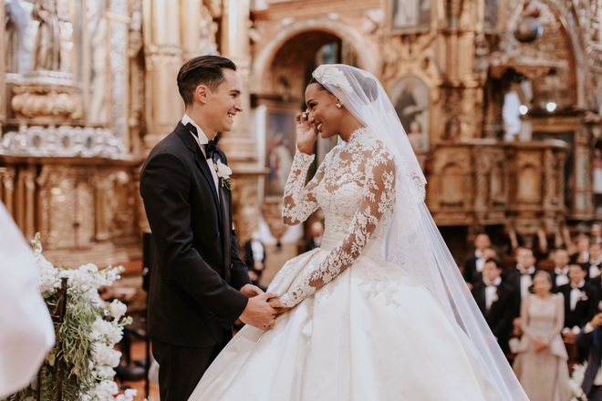 Cô dâu xinh đẹp diện váy cưới của nhãn hiệu xa xỉ Zuhair Murad với phần đuôi váy dài gần 5 m. Người đẹp kết hợp với trang sức đơn giản của Ritani và giày cao gót sa tanh trắng của Sarah Flint. Chú rể mặc một bộ vest hiệu Armani.