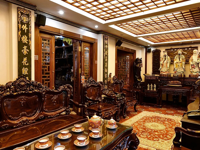 Phòng khách được coi là một trong những khu vực trọng tâm của căn nhà. Đây là nơi gia chủ trưng bày rất nhiều đồ nội thất bằng gỗ quý. (Ảnh: Sung Lee Nguyen)