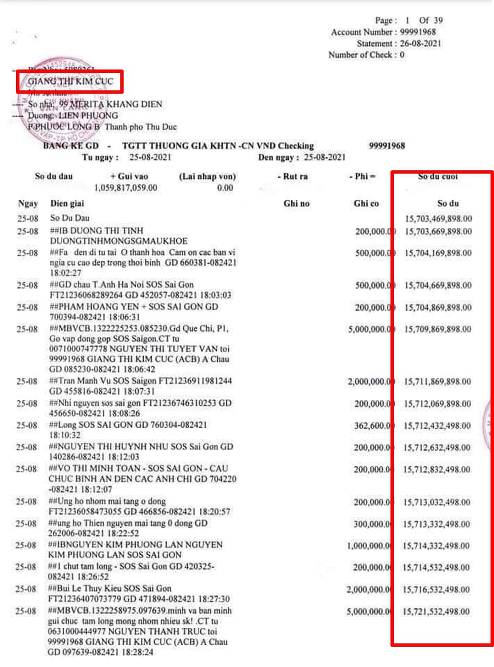 Chiều 11/9, một vài hình ảnh sao kê (được cho là của Giang Kim Cúc) được chia sẻ trên mạng xã hội cho thấy, trong tài khoản có gần 20 tỷ đồng, chứ không phải hết quỹ như lời trưởng nhóm Mai táng 0 đồng nói. Theo đó, ngày 25/8, tài khoản ghi nhận có hơn 15,7 tỷ đồng.