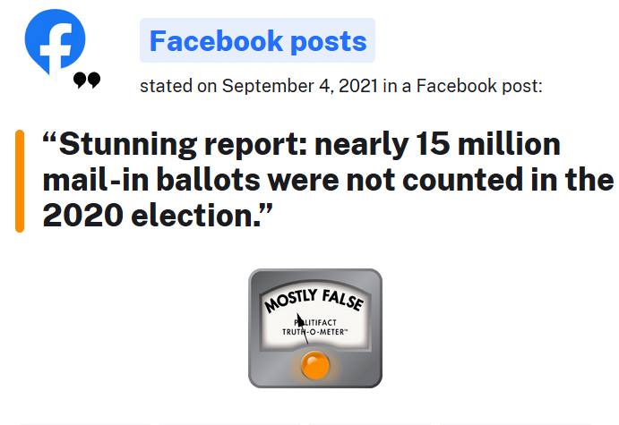 The reference to a "stunning report" gives the impression that a major voting irregularity was uncovered in the report. That’s not the case. Moreover, the post implies that 15 million mail ballots that should have been counted were not tabulated. That’s a misinterpretation of data from a federal report about mailed ballots of "unknown" status.