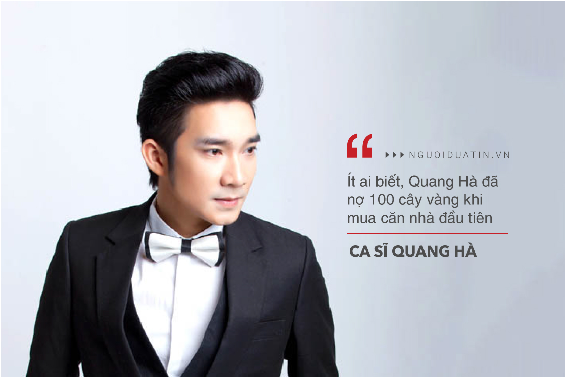 Sau này, khi đi diễn nhiều hơn, thậm chí là sang nước ngoài biểu diễn thì cát-xê được trả cao lắm. Đi diễn về, Quang Hà cứ để tiền trong két sắt, một thời gian mang ra đếm được nhiều một chút là đi mua đất, mua nhà. Ban đầu tôi định giấu, nhưng bạn bè cứ đồn thổi hỏi han nên tôi không giấu giếm mình có 13 ngôi nhà và một biệt thự trên 20 tỷ. Một số nhà tôi cho thuê, một số mua đi bán lại để có đất rộng hơn. Nói chung là cũng rất vất vả để mua được những mảnh đất mình ưng ý.