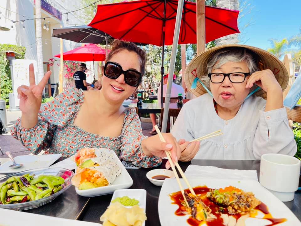 Mới đây, danh hài Thúy Nga chia sẻ trên trang cá nhân loạt ảnh cùng mẹ ruột và những người bạn thân đi ăn tại một nhà hàng Nhật Bản sang trọng bên Mỹ.