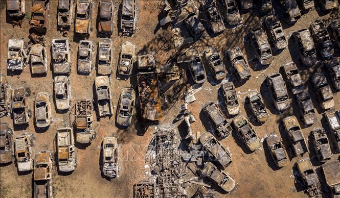 Ô tô bị thiêu rụi trong đám cháy rừng tại Greenville, California, Mỹ, ngày 24/9/2021. Ảnh: AFP/ TTXVN