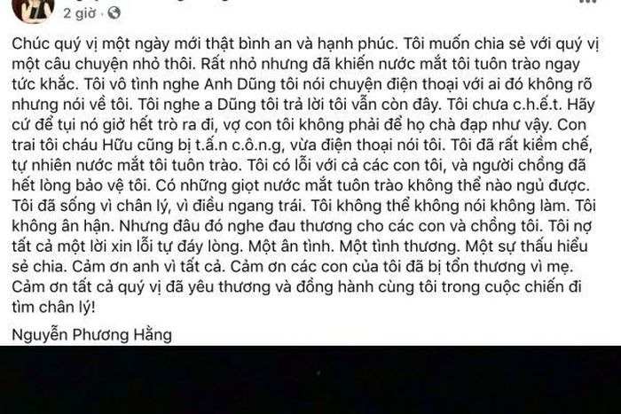 Theo nội dung tâm thư mà bà Nguyễn Phương Hằng chia sẻ, thời gian qua có khá nhiều cư dân mạng "tấn công" bà và gia đình bà. "Tôi vẫn còn đây. Tôi chưa chết. Hãy cứ để tụi nó giở hết trò ra đi. Vợ con tui không phải để họ chà đạp như vậy. Con trai tôi cháu Hữu cũng bị tấn công vừa điện thoại nói tôi",...bà Phương Hằng chia sẻ.