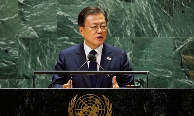 Tổng thống Hàn Quốc Moon Jae-in phát biểu tại phiên họp của Đại hội đồng Liên Hợp Quốc ở New York, Mỹ, ngày 21/9. Ảnh: Reuters.