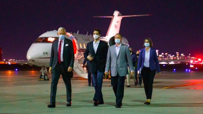 Hai công dân Canada Michael Kovrig và Michael Spavor (đi giữa) trở về Canada sau 3 năm bị Trung Quốc giam giữ (Ảnh: CTV News).