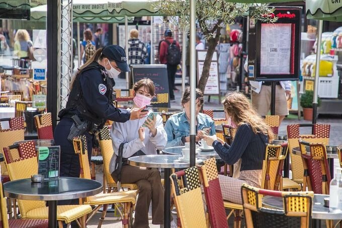 Cảnh sát Pháp kiểm tra thẻ xanh tiêm chủng của người dân tại một nhà hàng, tháng 8/2021. Ảnh: EPA