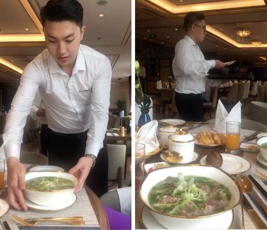 Theo đó, 2 vị khách nữ trong video được nhân viên khách sạn phục vụ tô phở với kích thước khá lớn. Thoạt nhìn, cư dân mạng dễ dàng nhận ra những chiếc tô, đĩa lẫn nhiều dụng cụ ăn uống khác trên bàn đều được dát vàng "xịn xò", đúng chuẩn với phong cách bấy lâu của khách sạn.