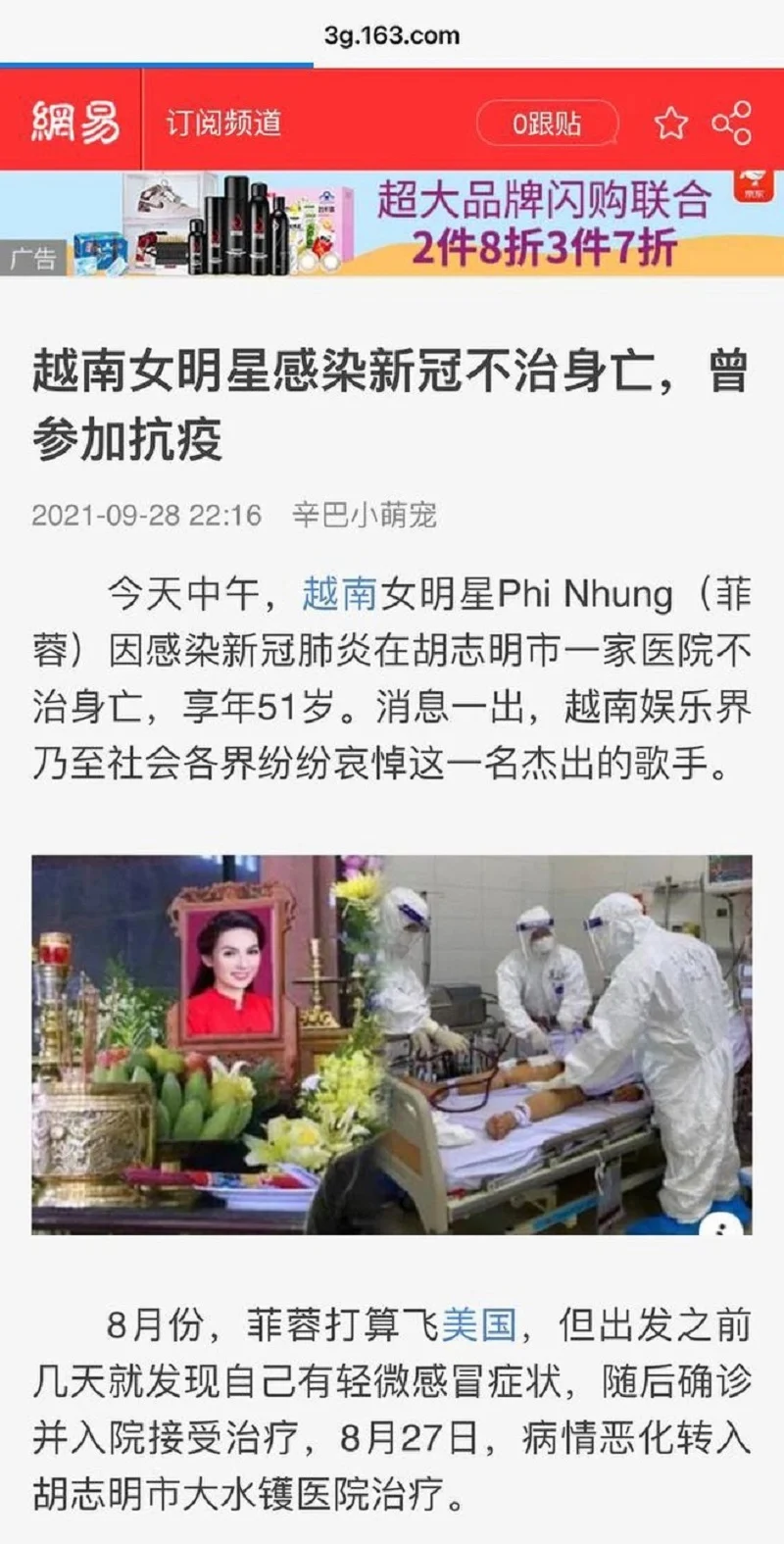 Theo như thông tin về cố nữ ca sĩ Phi Nhung vĩnh viễn ra đi vì Covid-19 đã khiến bạn bè đồng nghiệp cùng hàng triệu khán giả không khỏi xót thương. Sau khi sự ra đi của Phi Nhung đã được truyền thông Trung Quốc đưa tin, sử dụng loạt mỹ từ để tưởng nhớ gây xúc động. Thậm chí mới đây, báo mạng Trung Quốc còn chia sẻ thông tin này, còn gọi cố ca sĩ là "Đặng Lệ Quân của Việt Nam".