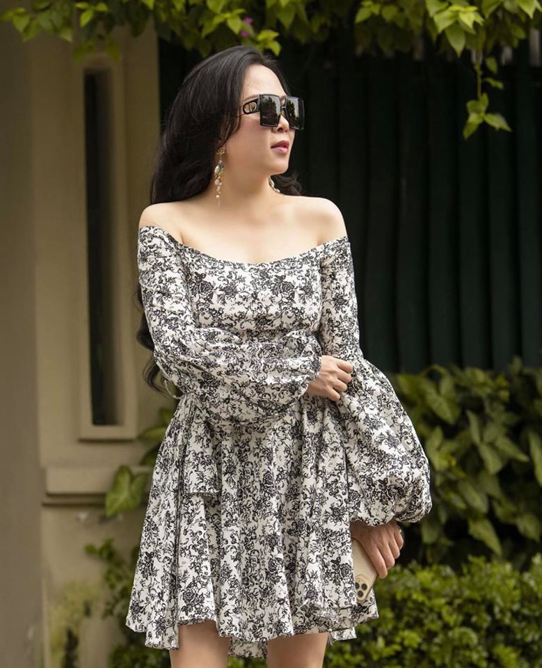 Thỉnh thoảng cô đổi gió với váy nhưng vẫn trung thành với kiểu trễ vai. Họa tiết hoa nhí, chiết eo và tay ống chuông lại sự trẻ trung cho người mặc.
