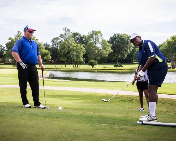 NeSmith (trái) hướng dẫn Malachi Johnson đánh golf. Ảnh: Nashville Tennessean