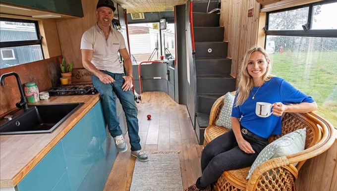 Lamorna và Gareth trên chiếc xe buýt được mua với gía 5.000 bảng, cải tạo thành nhà năm 2020. Ảnh: Dailymail.