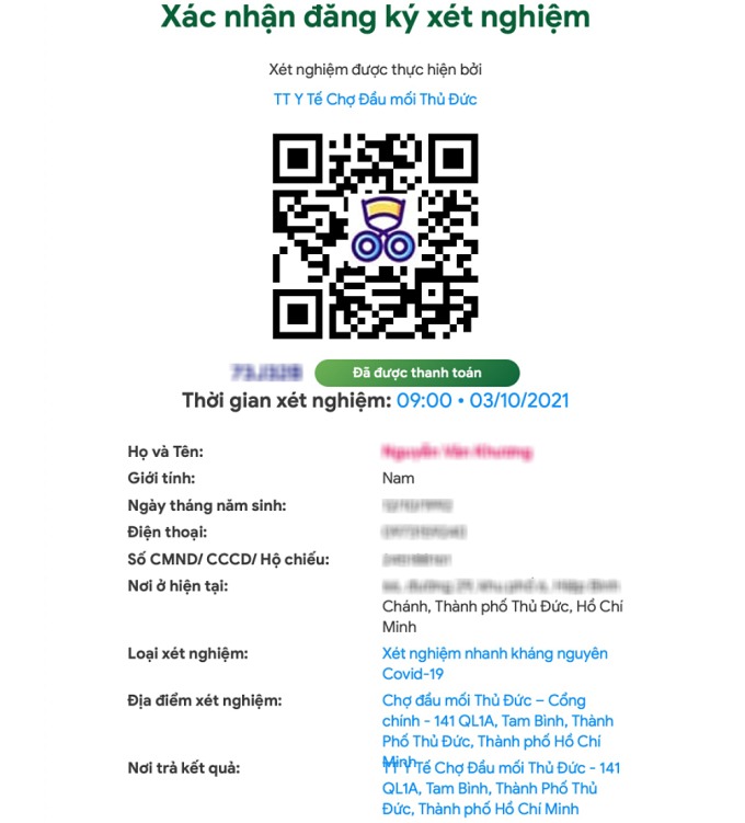 10h ngày 1/10, Quang Thuần, nhân viên giao hàng ở thành phố Thủ Đức, đến cổng chợ đầu mối để làm xét nghiệm Covid-19. Thay vì phải đứng xếp hàng và chờ đến lượt đăng ký như trước, lần này anh mang theo một mã QR lưu trong điện thoại và đến thẳng khu vực tiếp nhận thông tin. Nhân viên y tế quét mã, đối chiếu thông tin với giấy tờ tuỳ thân và hướng dẫn anh các bước làm xét nghiệm. Toàn bộ quy trình diễn ra trong vòng chưa đầy 5 phút.