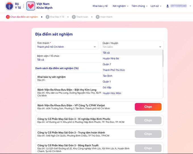 Giao diện hệ thống Việt Nam khoẻ mạnh. Người dân có thể lựa chọn địa điểm xét nghiệm gần mình trong khung giờ mong muốn.