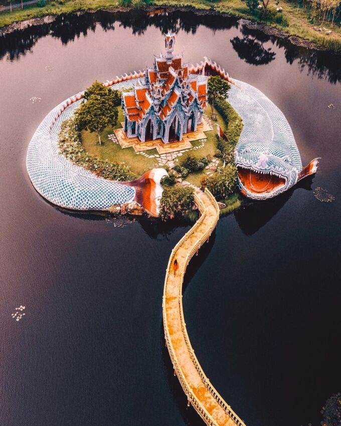 Đền Sumeru được bảo vệ bởi cá Anondha khổng lồ nằm giữa ao, đồng thời là điểm ngắm hoàng hôn đẹp mê ly tại Ancient city, cách Bangkok khoảng 30 km. Du khách đi qua cây cầu vàng đến sân ngôi đền nhỏ, nơi có thể chụp đủ kiểu ảnh "sống ảo". Ngoài ra, Ancient city rộng khoảng 97 ha, xây dựng từ năm 1963 trong suốt 20 năm, được ví như một Thái Lan thu nhỏ với hơn 115 công trình mô phỏng các kiến trúc vào thời Siam cổ đại. Ảnh: Instagram Ninjarod