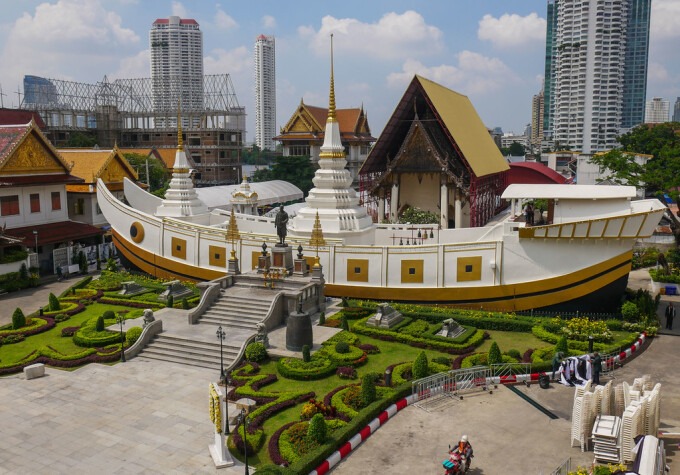 Wat Yannawa bên bờ sông Chao Phraya ở Bangkok, rất thuận tiện để đến bằng phương tiện công cộng. Mặc dù vậy, nó không được nhiều du khách nước ngoài biết. Điều làm nên sự khác biệt của đền là gian thờ hình con thuyền đặc trưng của Trung Hoa với "cột buồm" là các tháp được thiết kế theo lối kiến trúc chùa chiền Thái Lan, nhằm ghi lại thời kì giao thương hàng hải của Thái Lan và các nước khác. Chùa được xây dựng dưới thời vua Rama III, bảo tồn kĩ lưỡng tới nay. Ảnh: Fanclubthailand