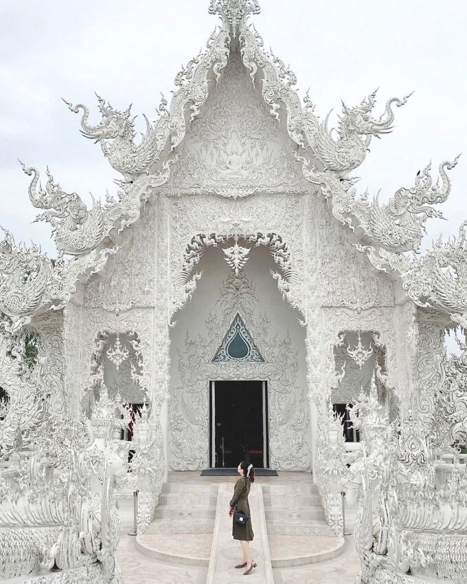 Tọa lạc bên ngoài thị trấn Chiang Rai, Wat Rong Khun có lối kiến trúc cổ điển pha lẫn phong cách siêu thực thu hút lượng lớn du khách mỗi năm. Đây cũng là một trong những điểm check in được yêu thích trên Instagram với hàng trăm góc ảnh độc đáo. Đền được phủ trắng, bao bọc bởi những mảnh thủy tinh lấp lánh. Phía ngoài là những bức tượng ác quỷ, đầu lâu và nhiều thứ kì lạ khác, gợi sự tò mò cho khách tham quan. Ảnh: Instagram Mukipearl
