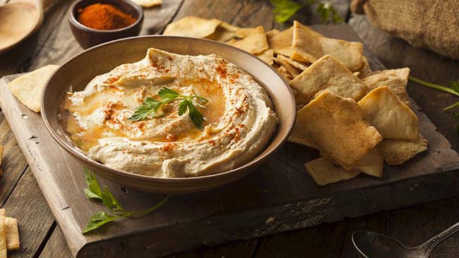 12. Sốt hummus Món sốt màu be phổ biến trên toàn thế giới này được làm từ đậu gà nghiền, bột mè, nước cốt chanh và tỏi. Mọi người trên khắp thế giới yêu thích hummus vì hương vị của nó thơm và rất giàu dinh dưỡng. Khi được phục vụ, nó thường được phủ một lớp dầu ô liu, sau đó được dùng để chấm với rau củ hoặc làm nhân cho các loại bánh mì dẹt như pita.