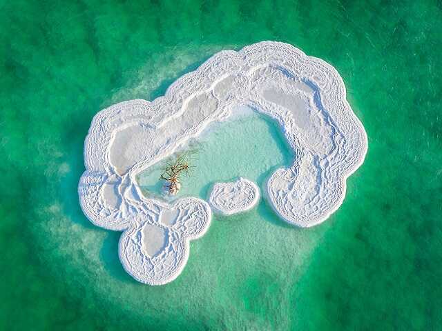 Hòn đảo đặc biệt này được tạo nên hoàn toàn từ muối trắng. Nằm ở trung tâm của Biển Chết, một trong những vùng biển mặn nhất thế giới, Đảo Muối là vùng đảo nhỏ màu trắng, bao quanh là nước màu ngọc làm tuyệt đẹp vời. Với nồng độ muối 34%, không có bất cứ loại đồng vật hay thực vật nào có thể tồn tại ở đây. Thế nhưng, trên hòn đảo này lại có sự tồn tại của một cây nhỏ, cắm rễ giữa lớp muối trắng tinh của đảo. Tuy nhiên, để giúp cây có được sự sống như hiện tại, một người đàn ông địa phương đã mang đến nguồn dinh dưỡng giúp cây phát triển mỗi ngày.
