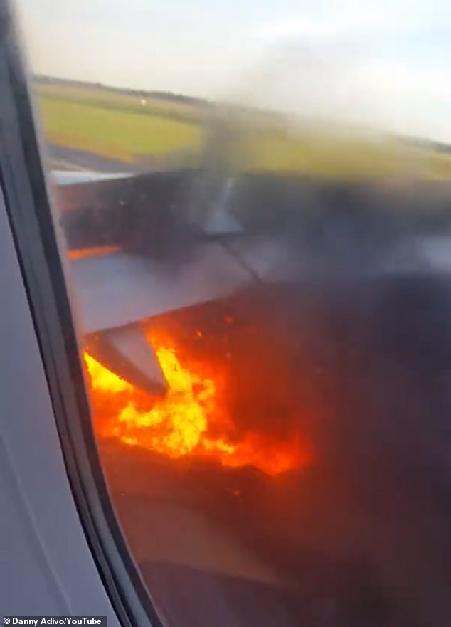 Động cơ máy bay bốc cháy ngùn ngụt trên đường băng. (Ảnh: Youtube).