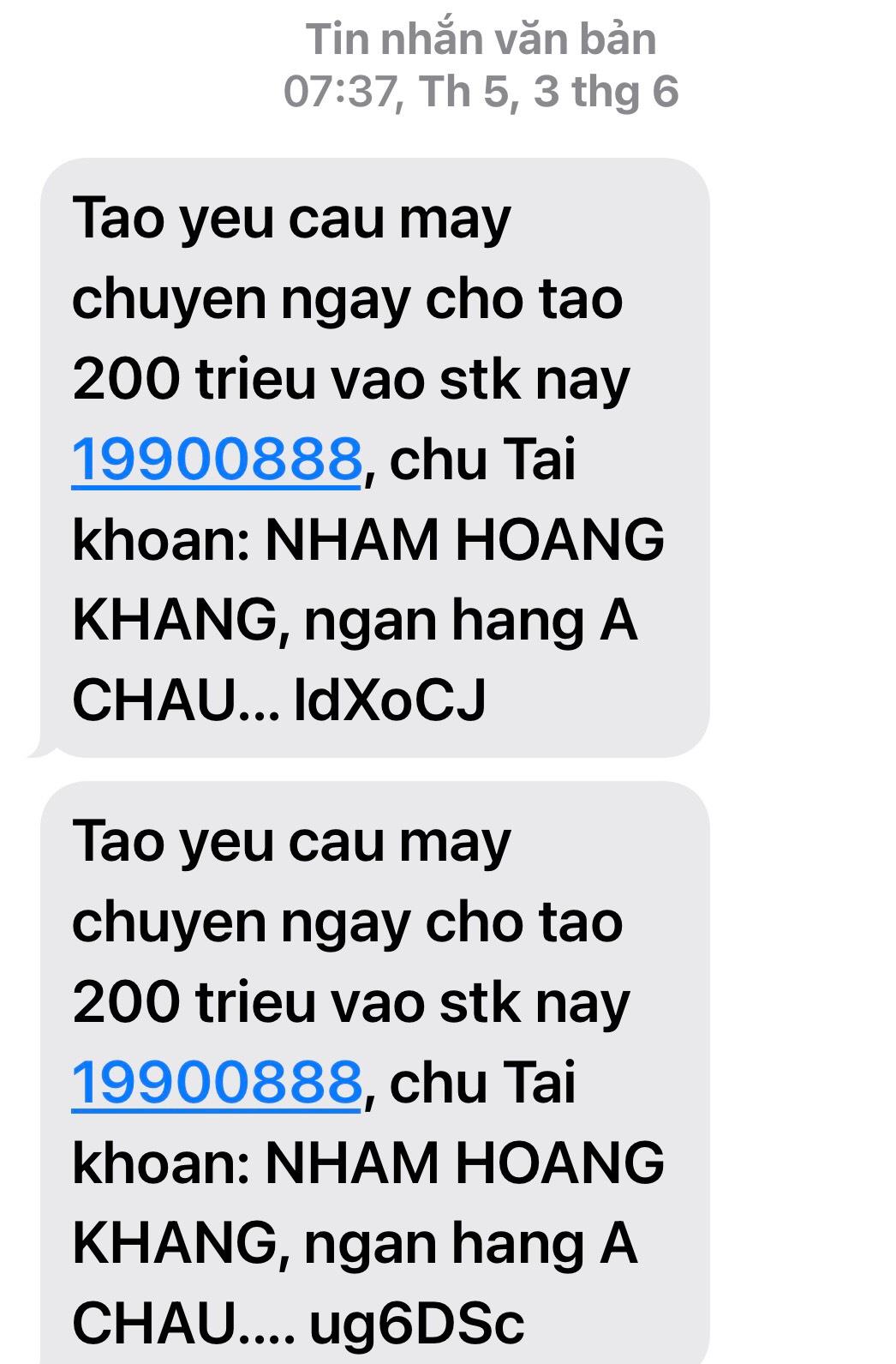 Ngày 3/6, ông liên tục nhận được các tin nhắn tống tiền với nội dung: "Tao yêu cầu mày chuyển ngay cho tao 200 triệu vào stk này 19900888, chủ tài khoản: NHAM HOANG KHANG, ngân hàng Á Châu…"