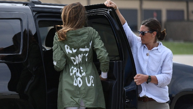 Bà Melania mặc chiếc áo có dòng chữ 'Tôi chẳng quan tâm đâu' khi tới Texas năm 2018. Ảnh: AFP