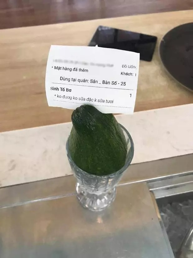Trên thực tế, món sinh tố bơ vẫn có thể được hoàn thiện nhờ xay bơ với đá/nước không, một dạng thức uống nguyên chất, thay vì mang cho khách nguyên quả bơ - một cách ứng xử không phù hợp.