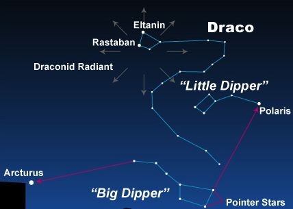 Vì vậy theo Earthsky, để quan sát mưa sao băng Draconids, hãy tìm một chòm sao hình con rồng trên bầu trời. Con rồng Thiên Long sẽ như đang bay lượn phía trên 2 chòm sao nổi tiếng là Đại Hùng và Tiểu Hùng. Đôi mắt rồng chính là 2 ngôi sao khá sáng Rastaban và Eltanin, cũng là điểm mà các ngôi sao băng xuất phát.
