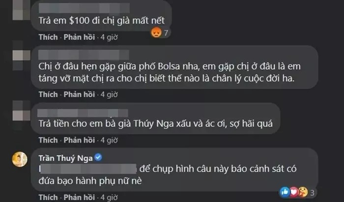 Liên tục bị réo tên, Thúy Nga liền lên tiếng phản bác: "Tạo Facebook ảo kiếm chuyện thì gặp trực tiếp chị luôn nhé. Danh sách mạnh thường quân mình trả xong rồi nhé. Trong danh sách cũng không có ai tên đẹp như em mà tính bẩn như em đâu này", "Xạo vậy bây", "Để chụp hình câu này báo cảnh sát có đứa bạo hành phụ nữ nè”.