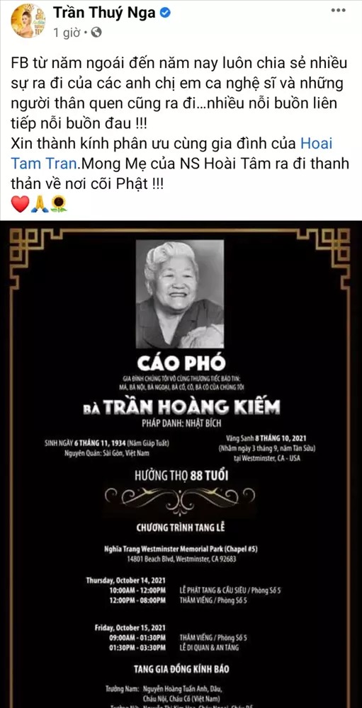 Thuý Nga đăng hình ảnh cáo phó của mẹ Hoài Tâm, chia buồn cùng đồng nghiệp trước sự mất mát này