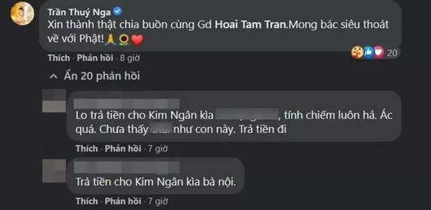 Tuy nhiên, trong lúc mọi người dành sự trân trọng cho người nằm xuống thì một số bộ phận cư dân mạng lại tràn vào để lại bình luận đả kích, yêu cầu Thúy Nga phải trả tiền từng ủng hộ cho ca sĩ Kim Ngân.
