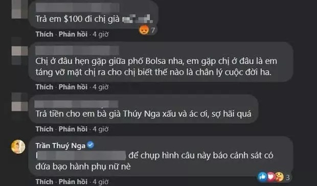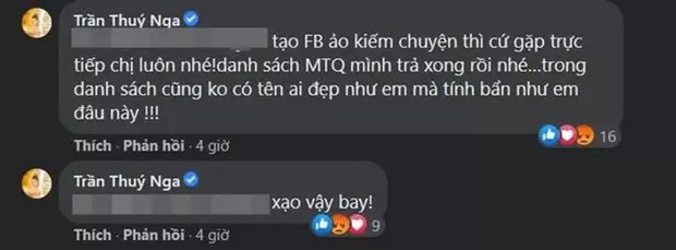 Trước màn công kích này, Thúy Nga liền lên tiếng phản bác: "Tạo Facebook ảo kiếm chuyện thì gặp trực tiếp chị luôn nhé. Danh sách mạnh thường quân mình trả xong rồi nhé. Trong danh sách cũng không có ai tên đẹp như em mà tính bẩn như em đâu này", "Xạo vậy bây", "Để chụp hình câu này báo cảnh sát có đứa bạo hành phụ nữ nè”.