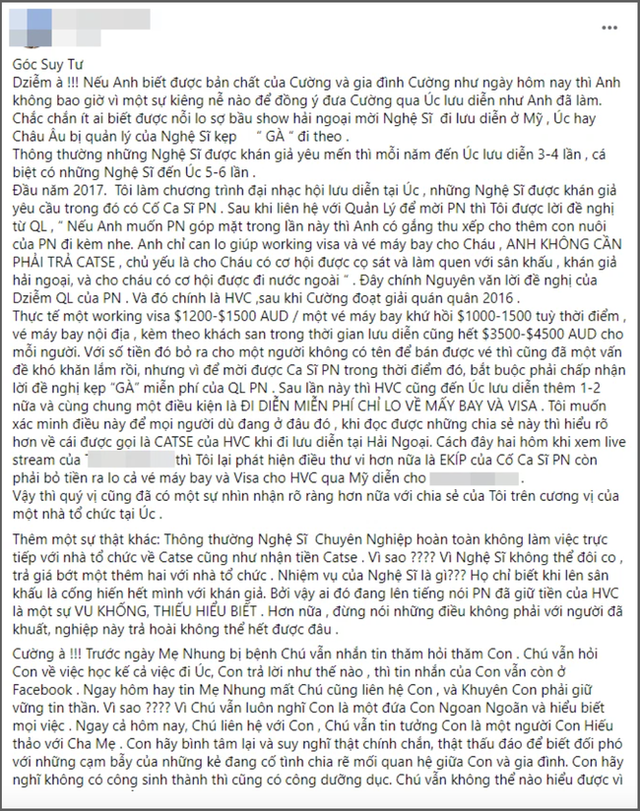 Trên trang cá nhân vừa qua, một người có uy tín làm trong ngành chuyên tổ chức các buổi biểu diễn cho nghệ sĩ Việt tại Úc đã đăng tải bài viết dài để nói về việc của Phi Nhung cũng như Hồ Văn Cường .