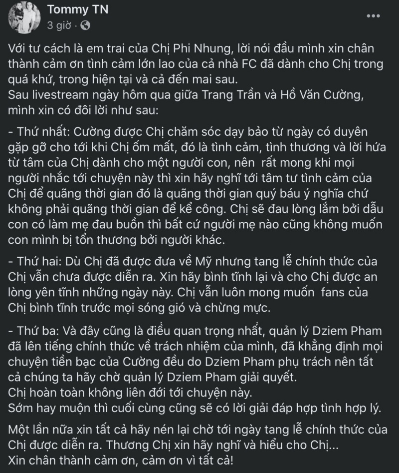 "Với tư cách là em trai chị Phi Nhung, lời nói đầu mình xin chân thành cảm ơn tình cảm lớn lao của cả nhà FC đã dành cho chị trong quá khứ, hiện tại và đến cả mai sau. Sau livestream ngày hôm qua giữa Trang Trần và Hồ Văn Cường, mình xin có đôi lời như sau.