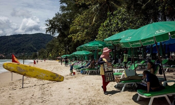 Người bán hàng và du khách trên bãi biển ở Phuket, Thái Lan, hồi tháng 8. Ảnh: AFP.