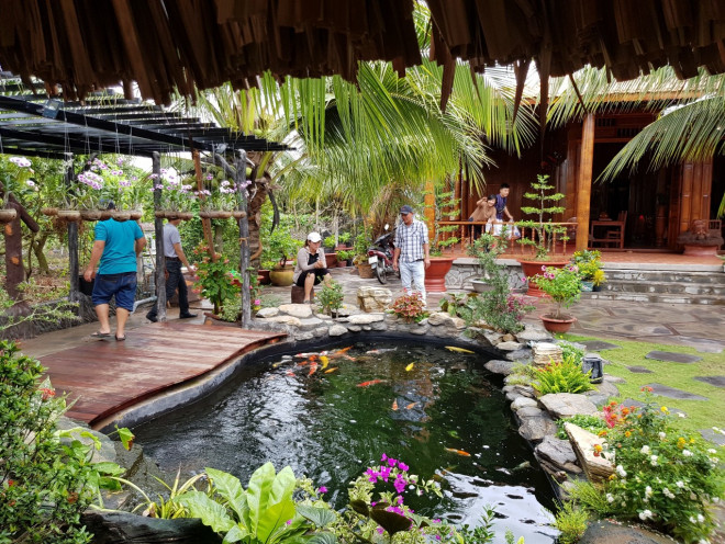 Xung quanh nhà được thiết kế nhiều tiểu cảnh và hồ cá, trong đó chủ yếu dùng dừa để làm vật liệu