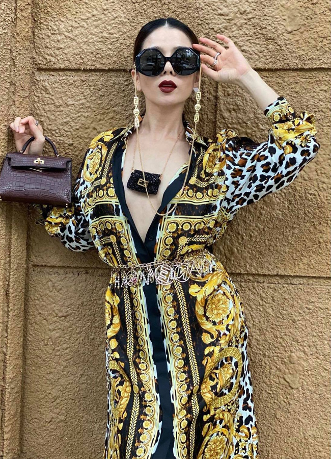 Cô phối váy sơ mi Versace khoét cổ sâu hun hút với túi Hermès và phụ kiện đến từ thương hiệu Chanel.