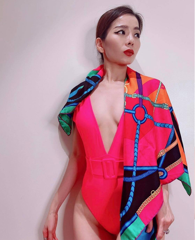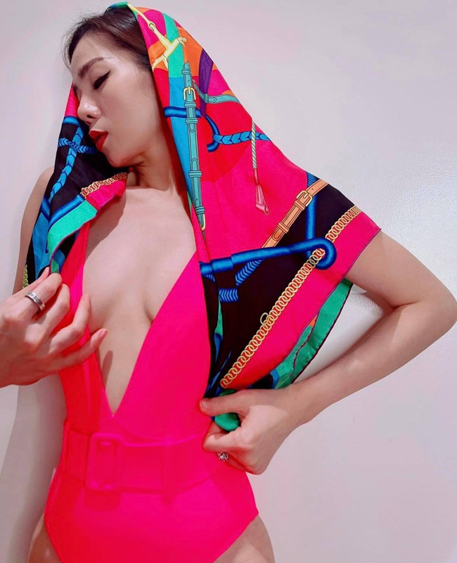 Lệ Quyên diện bikini 1 mảnh màu hồng neon nổi bật mix với khăn họa tiết Hermès.